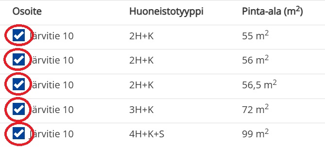 Valitse vasemmalla olevista täpistä vain ne, jotka vastaavat etsimääsi huoneistotyyppiä. Poista valinnat asunnoista, jotka eivät ole hakuehtojesi mukaisia.