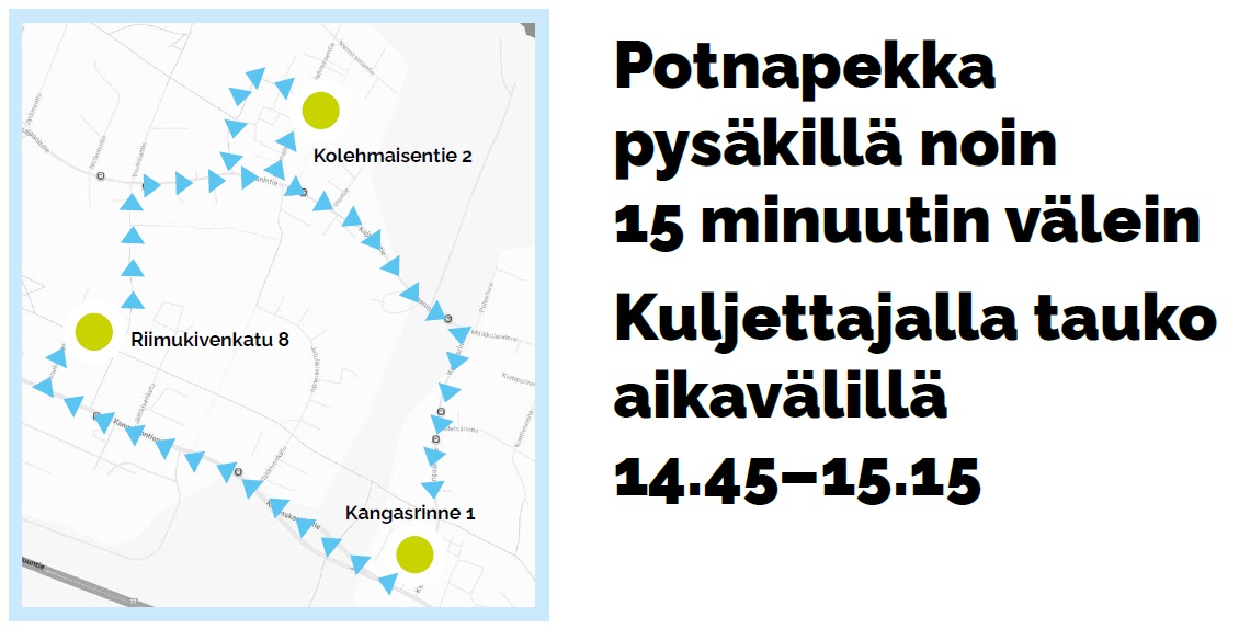 - Potna-Pekka kyyditsee esittelyasuntojen välillä. Katso reitti ja pysäkit täältä (avautuu uuteen välilehteen).