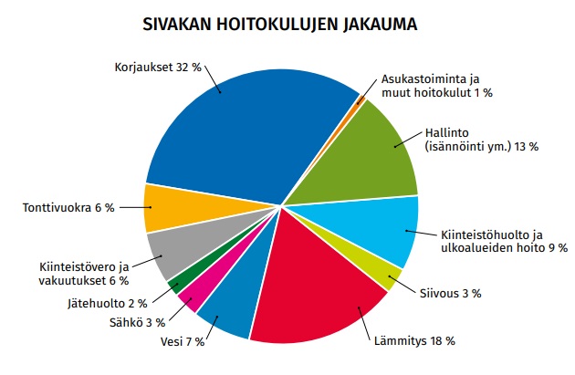 Hoitokulut sisältävät kiinteistöhoidon, kiinteistö- ja tonttivuokrat, lämmityksen ja sähkön, korjaukset sekä hallinnon.